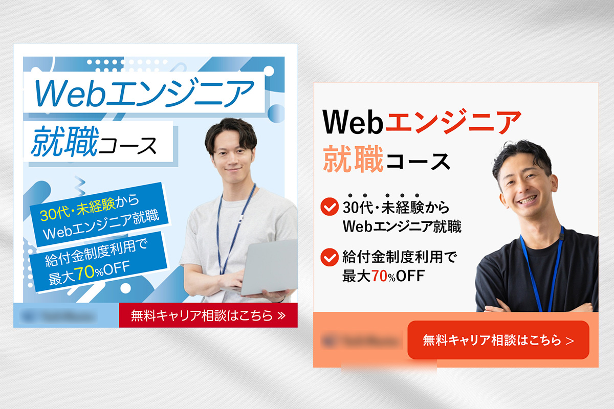 - ターゲットは30代の基本男性向けと考え、ブルーベースで「Webエンジニア就職コース」を一番目立つようにレイアウト