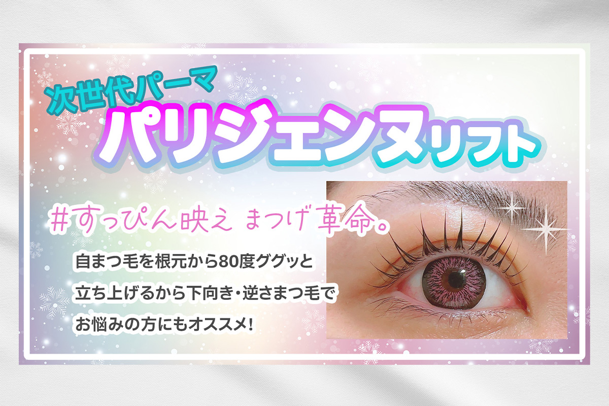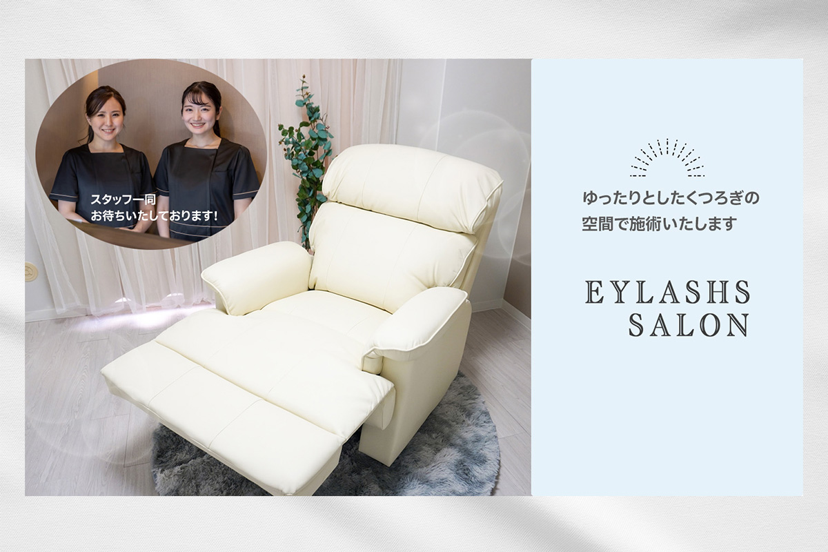 - 目元のアップで、まつげのカールや長さやナチュラルさが伝わり、簡単な施術説明でまつげデザイン選びのポイントをわかりやすく表現